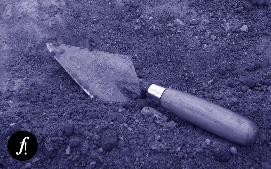 Em tom lilás, uma pá ou colher de pedreiro encontra-se num chão de terra.