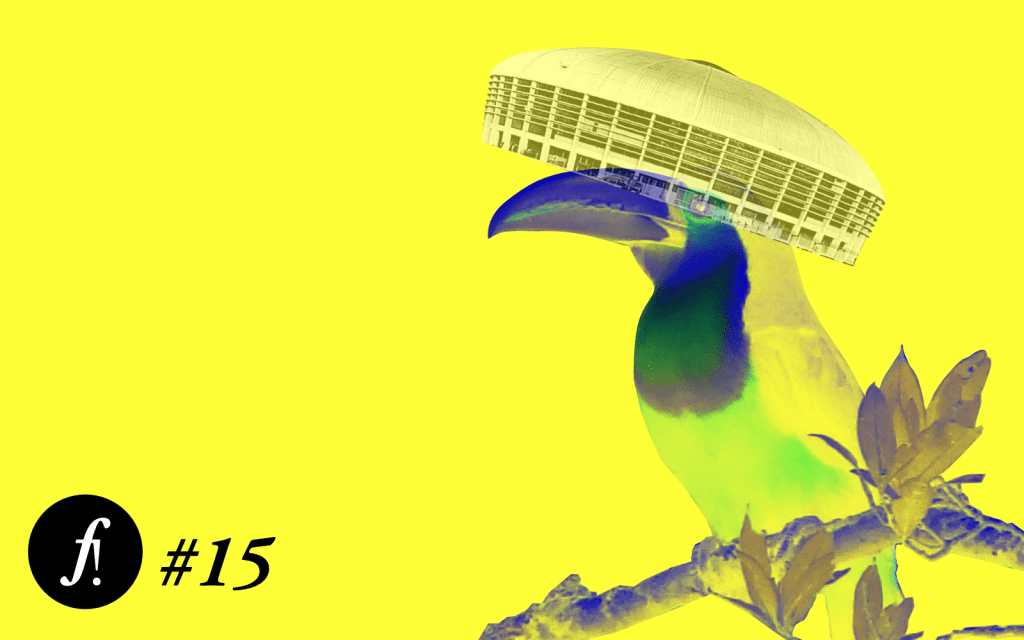 Em um fundo amarelo, vemos um tucano semitransparente. Em sua cabeça, como uma coroa, encontra-se o ginásio do Ibirapuera. No canto inferior esquerdo está a inscrição “F! #15”