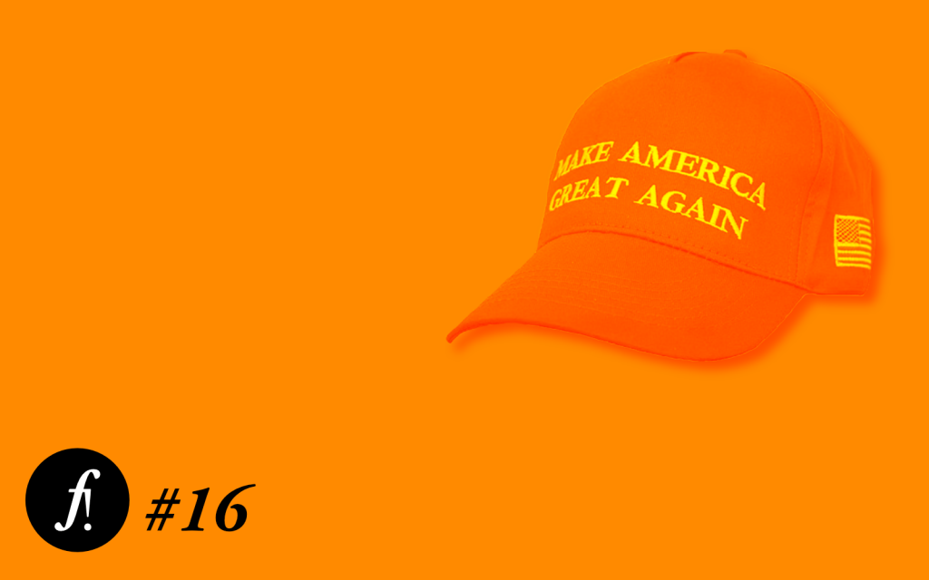 Num fundo laranja consta um boné com os dizeres “Make America Great Again” (“Faça a América grande novamente”). No canto inferior esquerdo consta a inscrição “F! #16”.