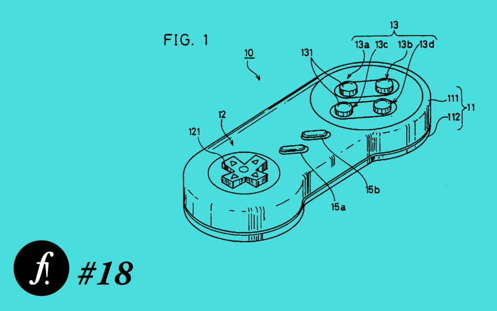 Sobre um fundo verde se encontra o desenho de um controle de videogame segundo o padrão de desenhos de registro de patente. No canto inferior esquerdo encontra-se a inscrição “F! #18”.