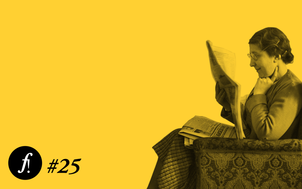 Sobre um fundo amarelo, uma mulher lê um jornal sentada em uma cadeira. No cando inferior esquerdo, a inscrição “F! #25”.