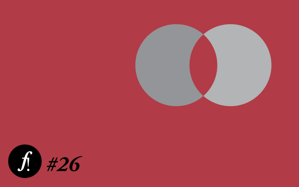 Sobre um fundo vermelho, duas esferas em diferentes tons de cinza se cruzam. No canto inferior esquerdo, consta a inscrição “F! #26”.